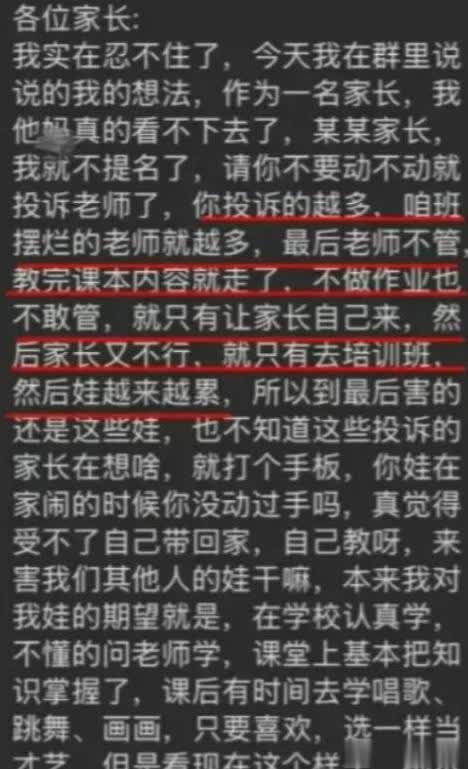 比如深圳某小学的家长在群里公开表达过自己的想法,认为无休止的投诉只会让老师变得越来越摆烂,最后老师可能只管教完课本内容就走,连作业都不敢布置。