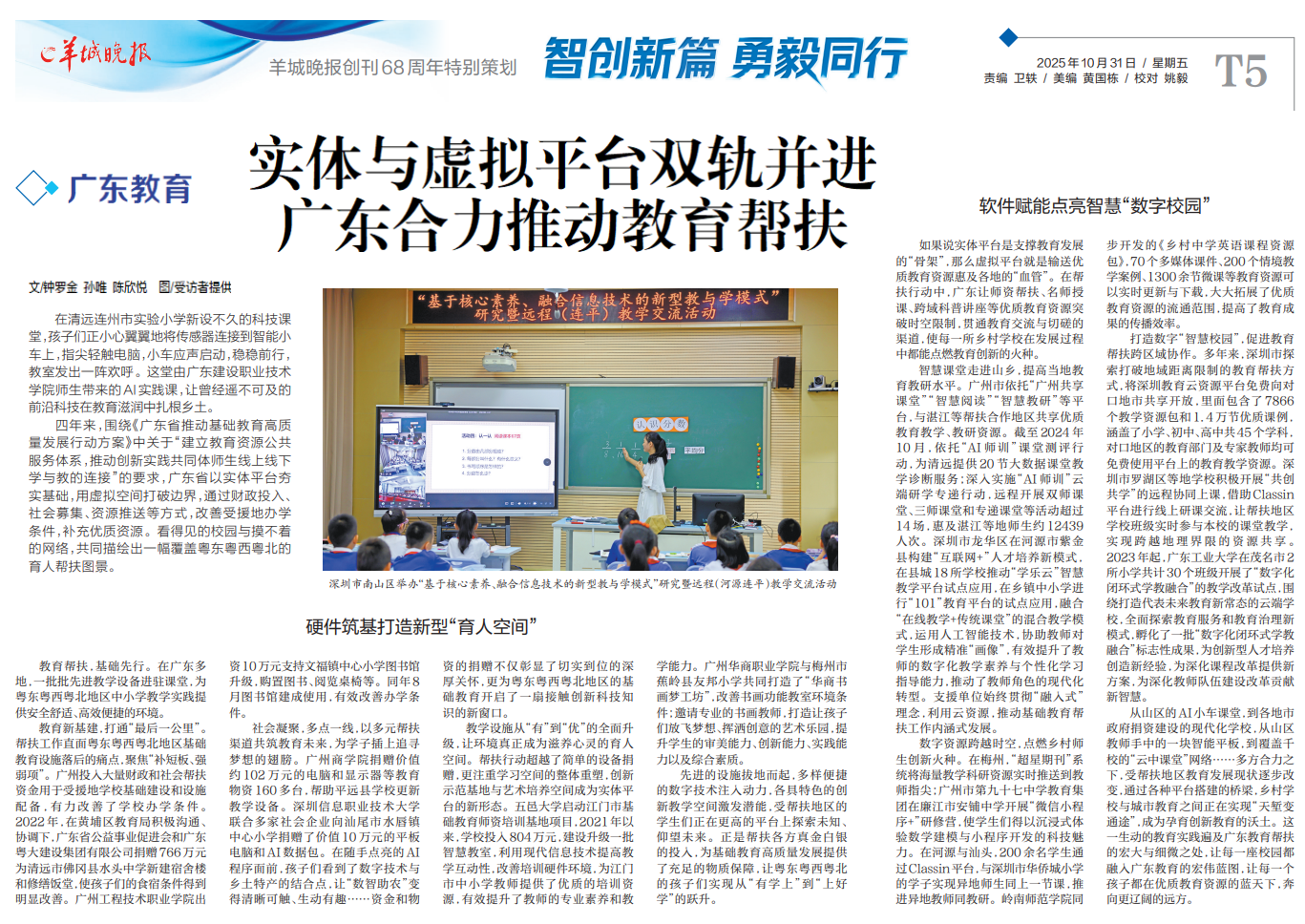 智慧课堂走进山乡,提高当地教育教研水平。广州市依托“广州共享课堂”“智慧阅读”“智慧教研”等平台,与湛江等帮扶合作地区共享优质教育教学、教研资源。截至2024年10月,依托“AI师训”课堂测评行动,为清远提供20节大数据课堂教学诊断服务;深入实施“AI师训”云端研学专递行动,远程开展双师课堂、三师课堂和专递课堂等活动超过14场,惠及湛江等地师生约12439人次。深圳市龙华区在河源市紫金县构建“互联网+”人才培养新模式,在县城18所学校推动“学乐云”智慧教学平台试点应用,在乡镇中小学进行“101”教育平台的试点应用,融合“在线教学+传统课堂”的混合教学模式,运用人工智能技术,协助教师对学生形成精准“画像”,有效提升了教师的数字化教学素养与个性化学习指导能力,推动了教师角色的现代化转型。支援单位始终贯彻“融入式”理念,利用云资源,推动基础教育帮扶工作内涵式发展。