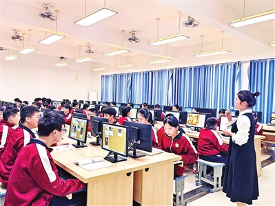 | 港北区第二初级中学学生坐在宽敞明亮的计算机室里上人工智能通识课。全媒体记者欧钰宇摄 |